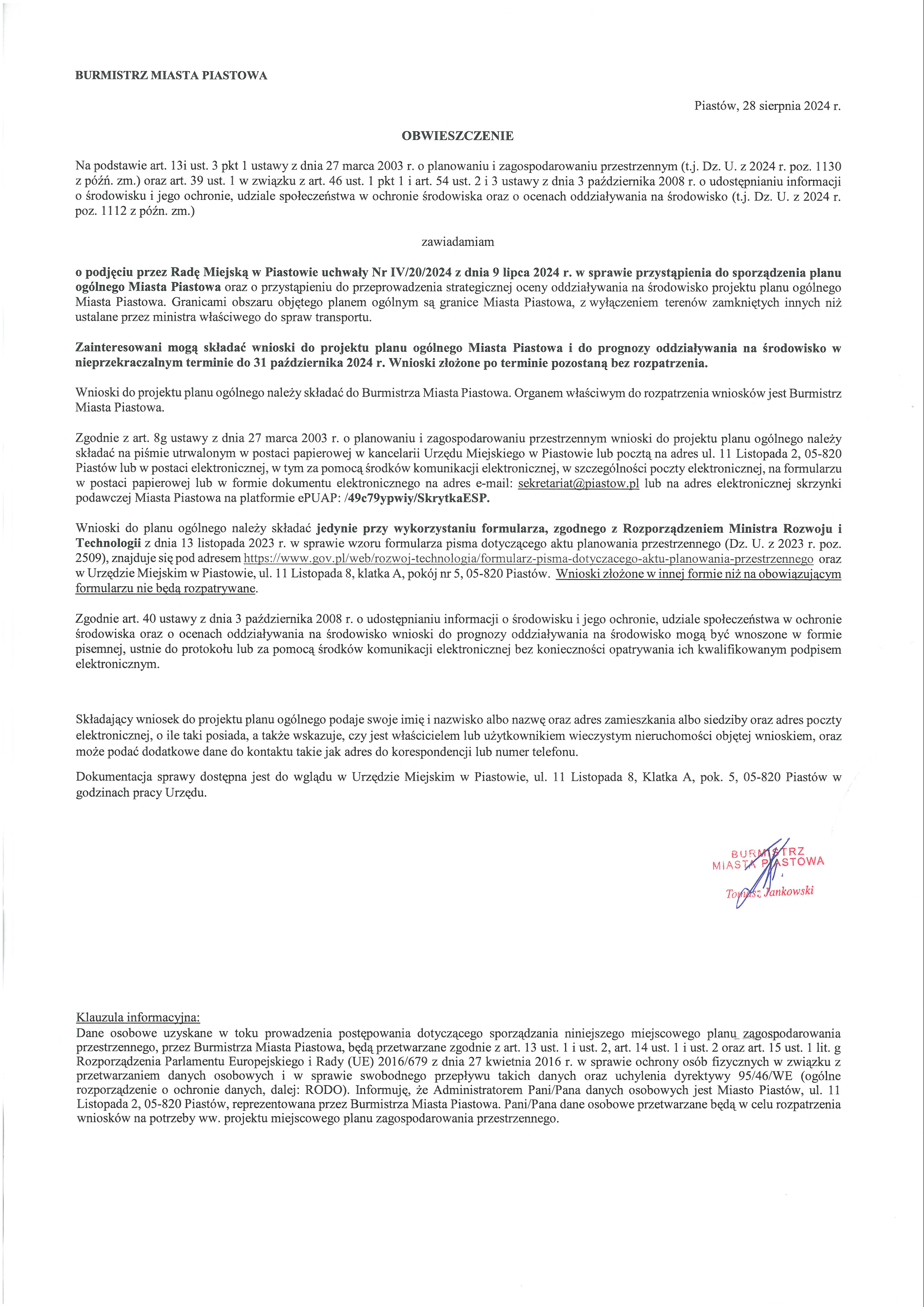 W dniu 9 lipca 2024 r. Rada Miejska w Piastowie podjęła Uchwałę Nr IV/20/2024 w sprawie przystąpienia do sporządzenia Planu Ogólnego Miasta Piastowa.